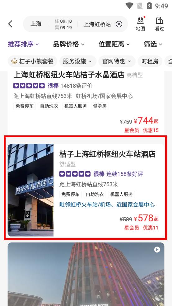 2、在查詢結(jié)果中找到心儀酒店,比如桔子上海虹橋樞紐火車站酒店并點(diǎn)擊進(jìn)入。