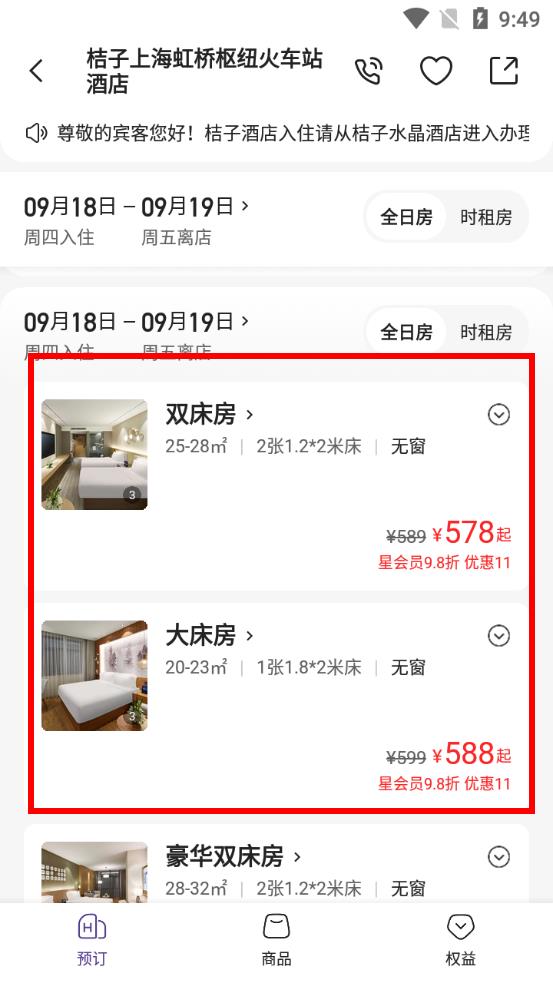 3、進(jìn)入酒店頁面后瀏覽房型如雙床房、大床房等,選擇合適房型。