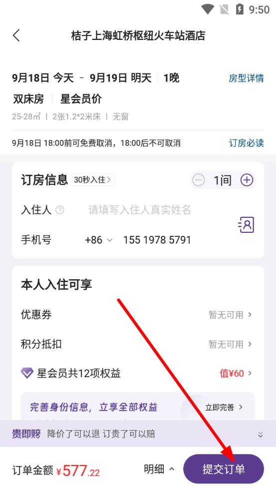 4、填寫訂房信息包括入住人姓名、手機(jī)號(hào)等,確認(rèn)訂單金額后點(diǎn)擊提交訂單完成預(yù)訂。