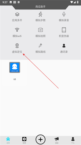 1、打開(kāi)西瓜助手應(yīng)用程序進(jìn)入主頁(yè)界面,找到并點(diǎn)擊虛擬定位按鈕,進(jìn)入虛擬定位相關(guān)操作頁(yè)面。
