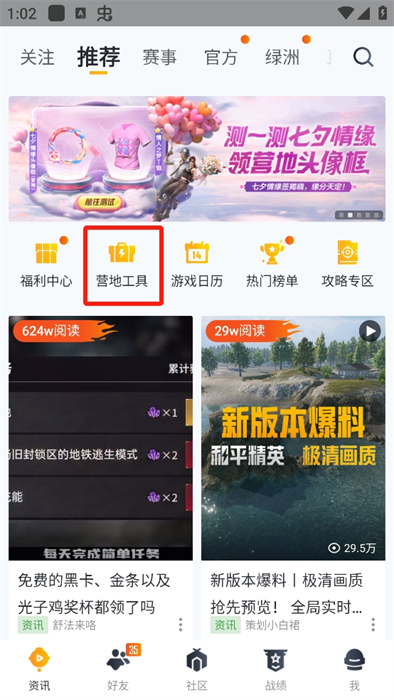 1、首先需要手機(jī)中有一個【和平營地】需要在和平營地中申請,打開和平營地,在其中點擊【營地工具】;