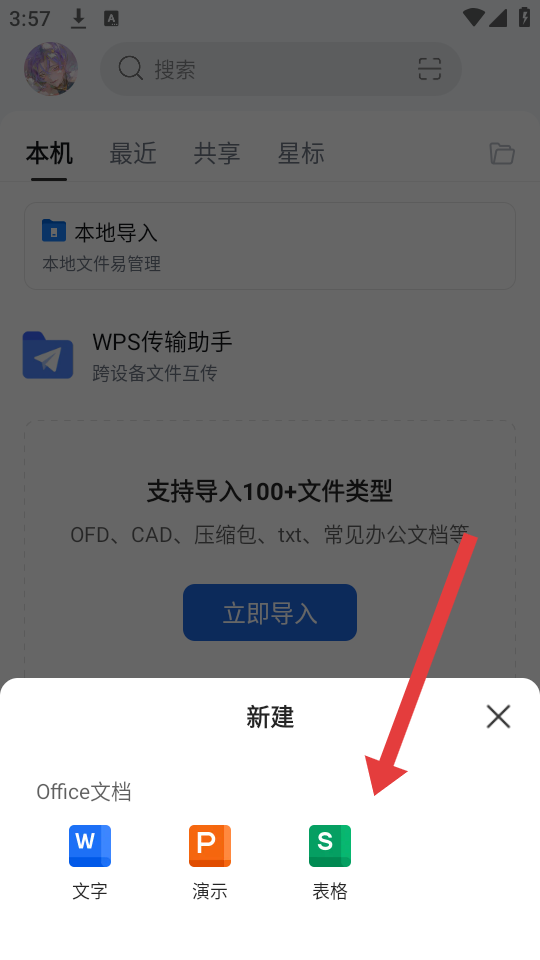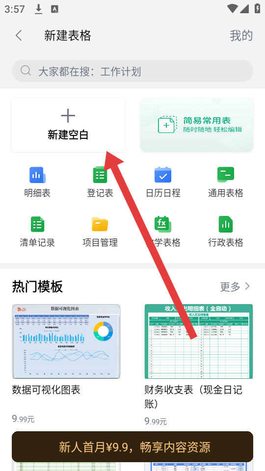 1、打開WPS Office APP,在首頁彈出的新建功能菜單中,點擊Office文檔板塊下的表格選項,進入新建表格頁面。