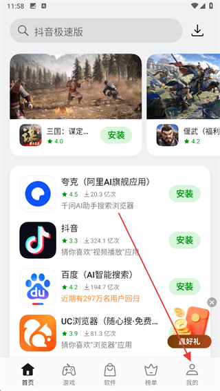 1、打開(kāi)OPPO軟件商店,在首頁(yè)點(diǎn)擊底部的我的選項(xiàng)。
