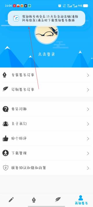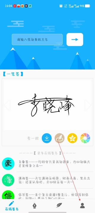 1、打開藝術(shù)簽名APP,點(diǎn)擊界面右下角的我的選項(xiàng),進(jìn)入個(gè)人中心頁面。