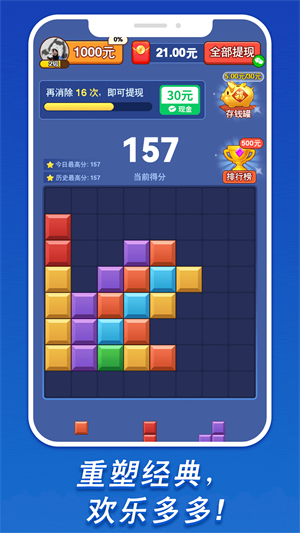 我要消磚塊是經典的俄羅斯方塊消除游戲,簡單的操作帶來趣味體驗,隨時在線暢玩闖關挑戰(zhàn),不斷刷新你的最高分數,每次挑戰(zhàn)都能獲得紅包獎勵,可隨時提現(xiàn)到賬。
