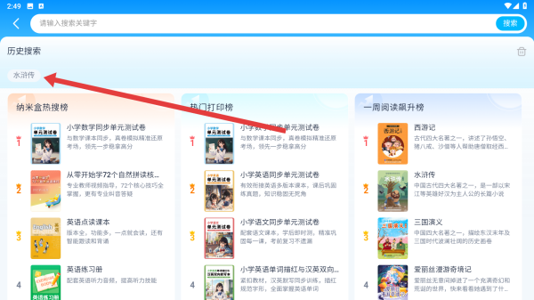 2、在搜索頁(yè)面中,可以點(diǎn)擊搜索過(guò)的歷史記錄,搜索課外書(shū)。
