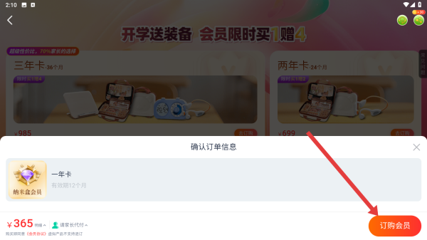 3、在確認(rèn)訂單信息的窗口中看到一年卡的價(jià)格信息后,點(diǎn)擊訂購會(huì)員按鈕進(jìn)行購買。