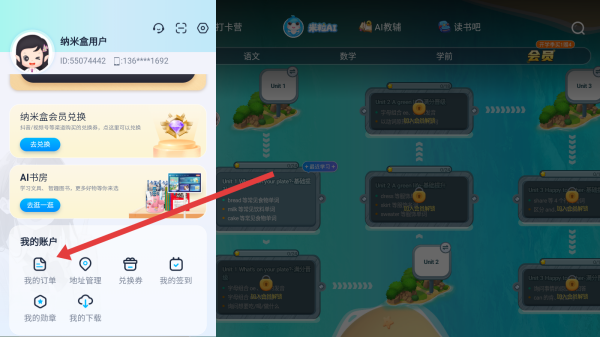 1、在進(jìn)入到納米盒app后,點(diǎn)擊賬號頭像區(qū)域可以打開側(cè)邊欄。