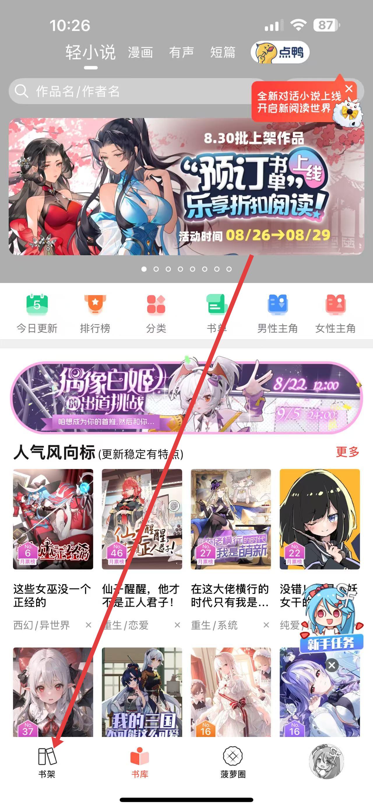 1、打開菠蘿包輕小說APP,點(diǎn)擊底部導(dǎo)航欄中的書架選項(xiàng),進(jìn)入書架界面。