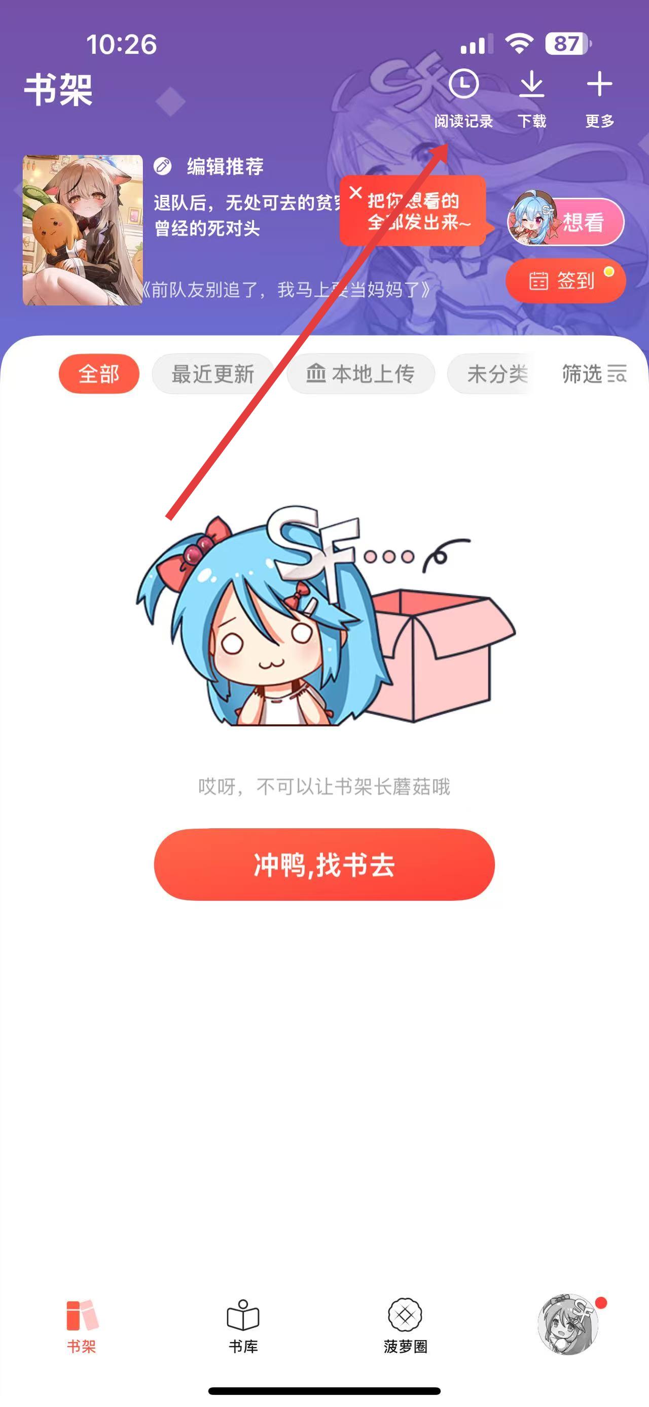2、在書架界面中,點(diǎn)擊右上方的閱讀記錄按鈕,進(jìn)入閱讀記錄頁面。