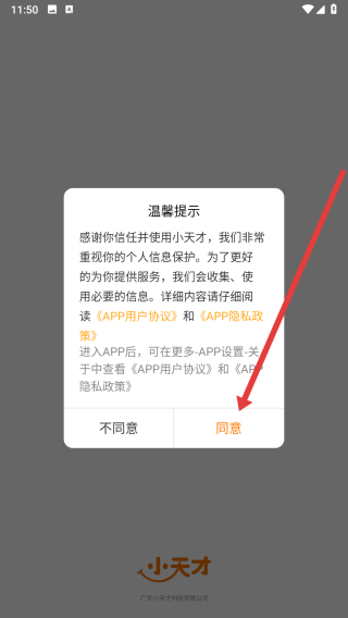 1、打開(kāi)小天才app后,通過(guò)點(diǎn)擊彈窗中的同意按鈕,進(jìn)入使用。