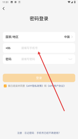4、在進(jìn)入到密碼登錄頁(yè)面中,可點(diǎn)擊輸入框依次填寫(xiě)手機(jī)號(hào)和密碼后完成登錄操作。