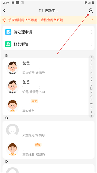 2、在手表通訊錄頁(yè)面,點(diǎn)擊右上角添加好友圖標(biāo),進(jìn)入添加聯(lián)系人頁(yè)面。