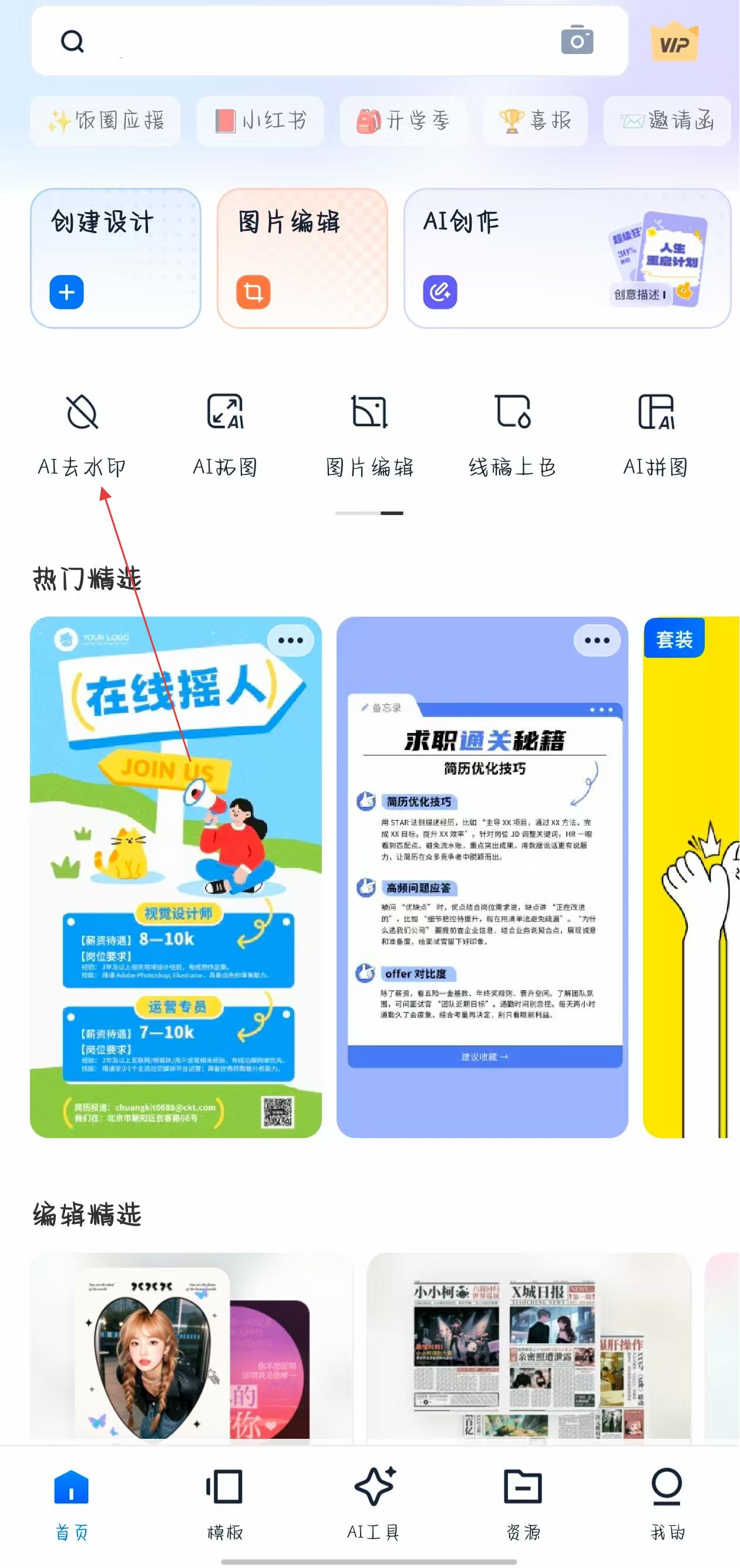 1、打開創(chuàng)客貼APP,在首頁點(diǎn)擊AI去水印選項(xiàng),進(jìn)入AI去水印功能頁面。