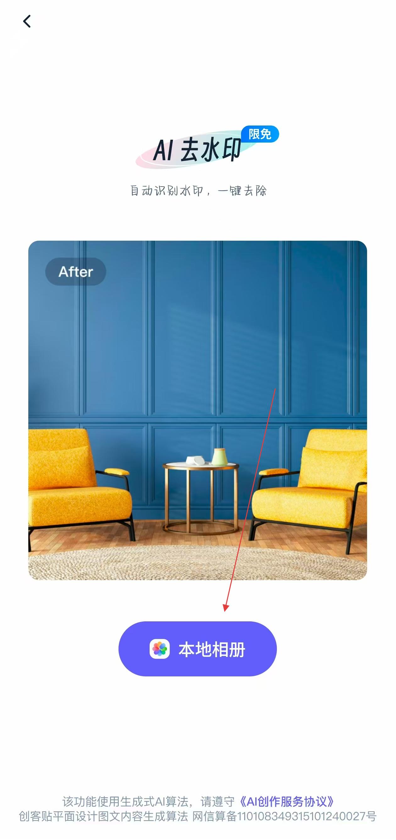 2、在AI去水印頁面,點(diǎn)擊本地相冊按鈕,從手機(jī)相冊中選取需要去除水印的圖片。