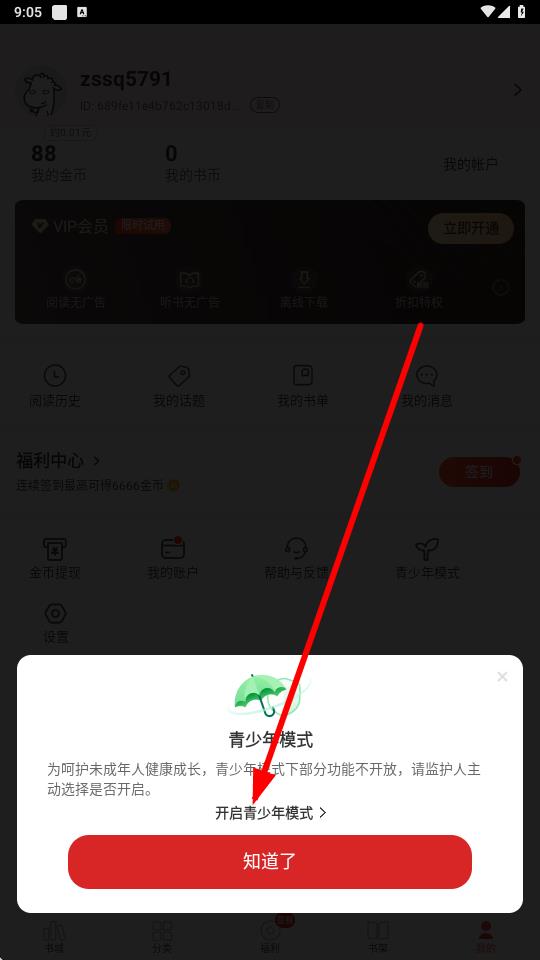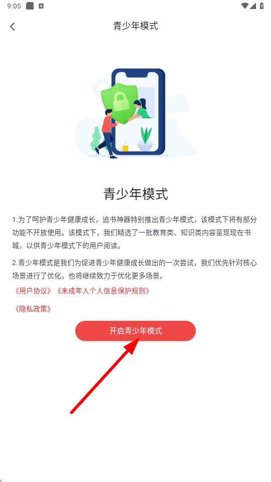 1、進(jìn)入追書神器我的頁面,點(diǎn)擊開啟青少年模式>。