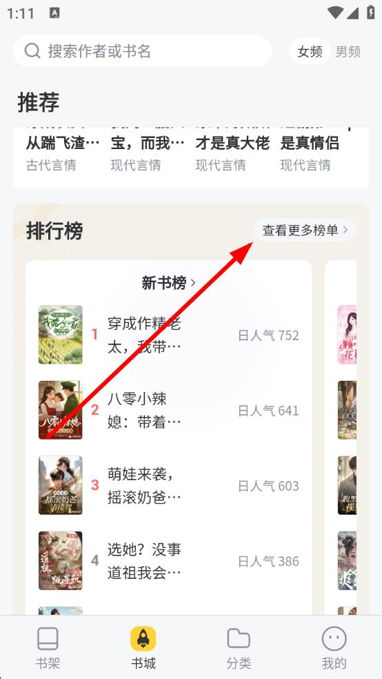 2、在書城界面的排行榜板塊,點(diǎn)擊查看更多榜單進(jìn)入詳細(xì)榜單頁面。