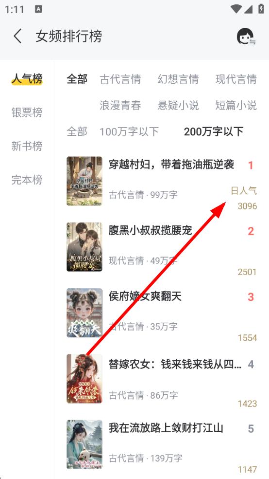 3、在詳細(xì)榜單頁面如女頻排行榜,找到目標(biāo)書籍,查看其對應(yīng)的日人氣等數(shù)據(jù),可大致了解閱讀量情況。