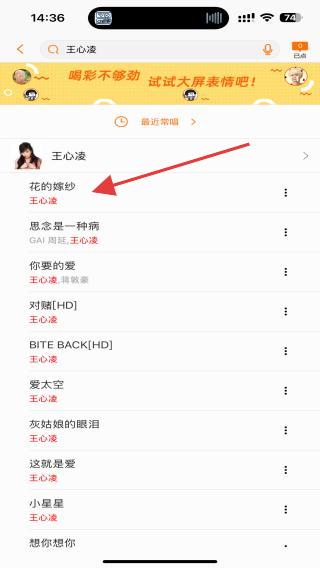 4、當(dāng)搜索結(jié)果出來后,找到想要點(diǎn)歌的目標(biāo)曲目,點(diǎn)擊即可點(diǎn)歌成功。