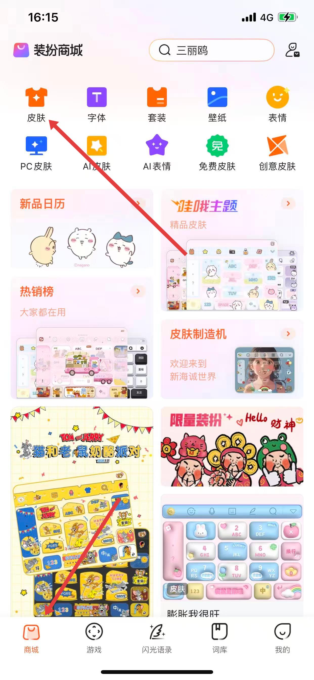 1、打開(kāi)搜狗輸入法,點(diǎn)擊底部導(dǎo)航欄中的商城,點(diǎn)擊皮膚選項(xiàng),進(jìn)入皮膚選擇界面。