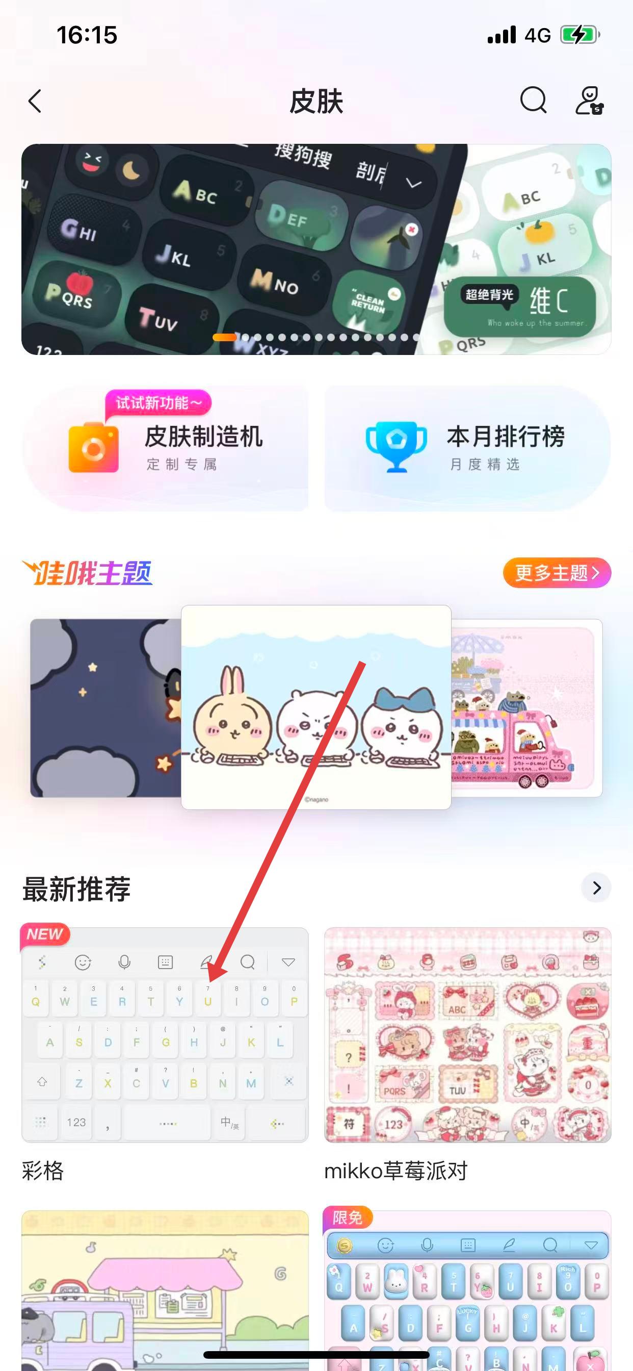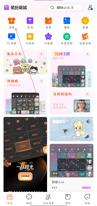1、打開(kāi)搜狗輸入法,進(jìn)入裝扮商城界面,點(diǎn)擊皮膚選項(xiàng),進(jìn)入皮膚界面。