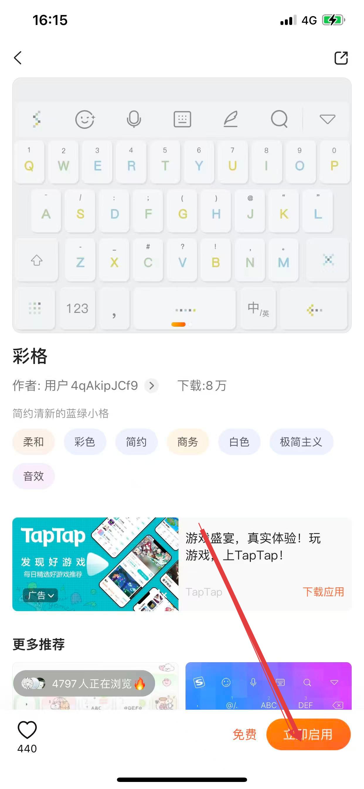 3、進(jìn)入皮膚詳情頁(yè),然后點(diǎn)擊右下角的立即啟用按鈕,即可成功更換搜狗輸入法的皮膚背景。