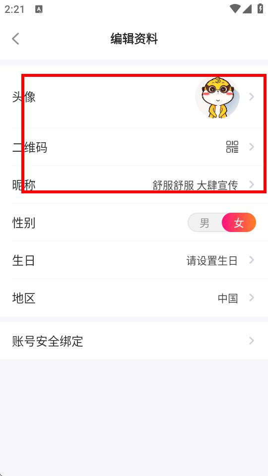 4、進(jìn)入編輯資料頁面,能對頭像、昵稱等個人資料進(jìn)行修改設(shè)置。