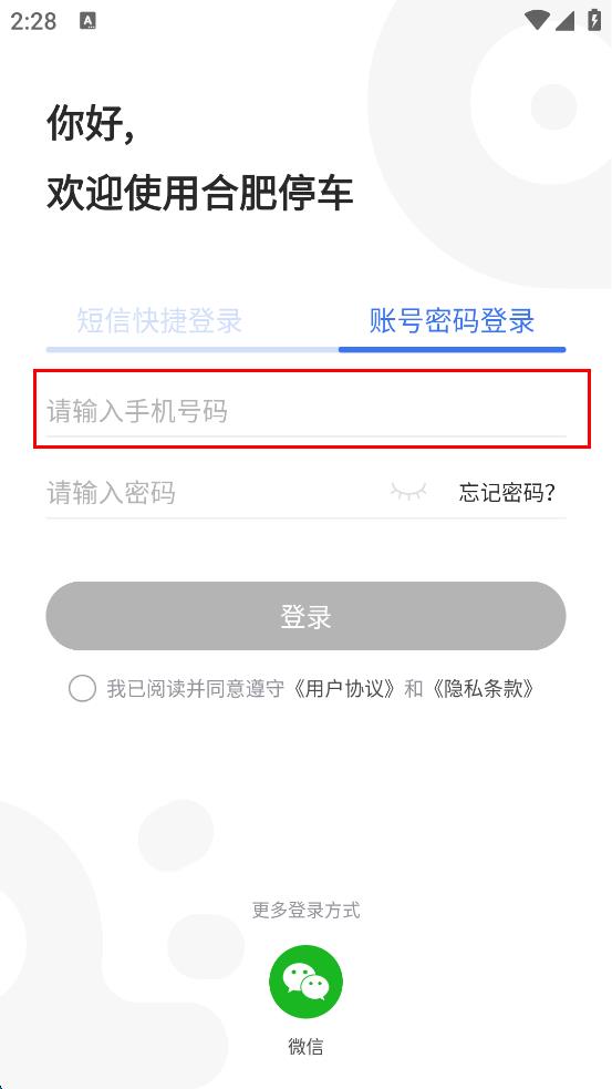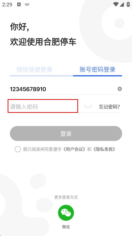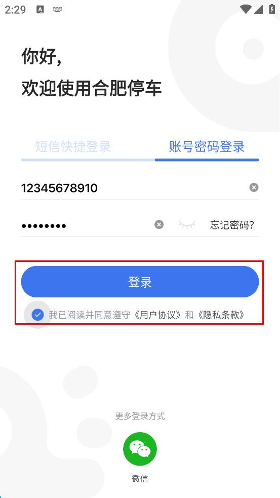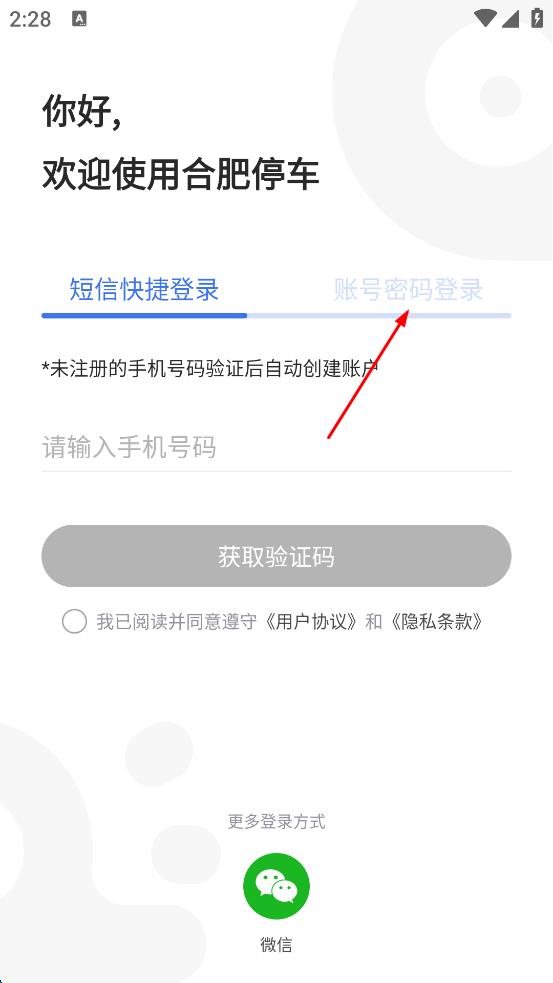 1、打開合肥停車軟件,在登錄界面找到“賬號密碼登錄”選項,點(diǎn)擊該選項切換到賬號密碼登錄頁面。