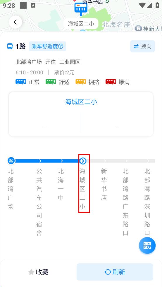 4、在1路公交詳情頁面,可查看線路從北部灣廣場(chǎng)開往工業(yè)園區(qū)的運(yùn)營(yíng)時(shí)間、票價(jià)及站點(diǎn)等信息。