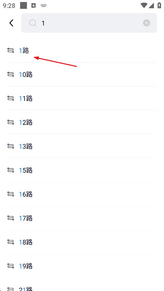 3、在搜索頁面輸入框中輸入“1”,下方會(huì)出現(xiàn)相關(guān)線路列表,點(diǎn)擊“1路”,進(jìn)入1路公交詳情頁面。