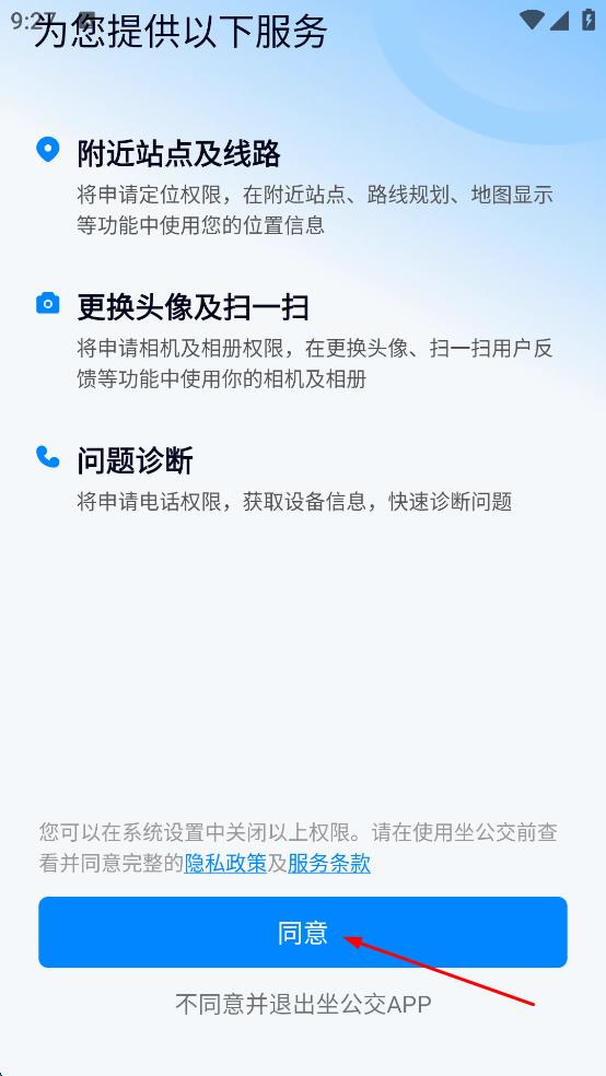 1、打開坐公交APP,會(huì)彈出服務(wù)權(quán)限提示框,點(diǎn)擊同意,進(jìn)入APP主界面。