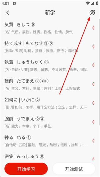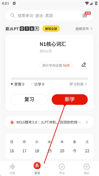 1、打開MOJITest,在背詞頁面點擊新學按鈕。