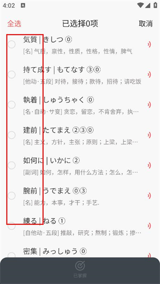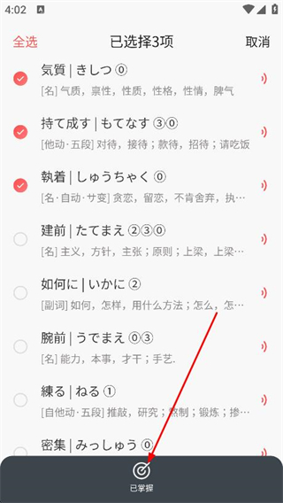 3、在詞匯列表中,勾選需要標記為已掌握的詞匯。