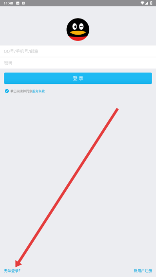 1、在QQ登錄頁面中,要是無法登錄賬號(hào),可以點(diǎn)擊底部的無法登錄按鈕解決。