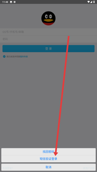 2、在彈出的選項(xiàng)中,可以通過點(diǎn)擊短信驗(yàn)證登錄選項(xiàng),進(jìn)行登錄。