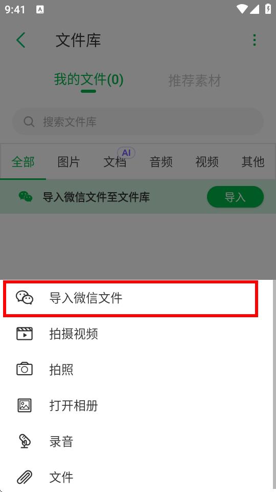 4、在彈出的菜單中,可選擇導(dǎo)入微信文件等多種導(dǎo)入方式,也按照對應(yīng)提示完成文件導(dǎo)入。