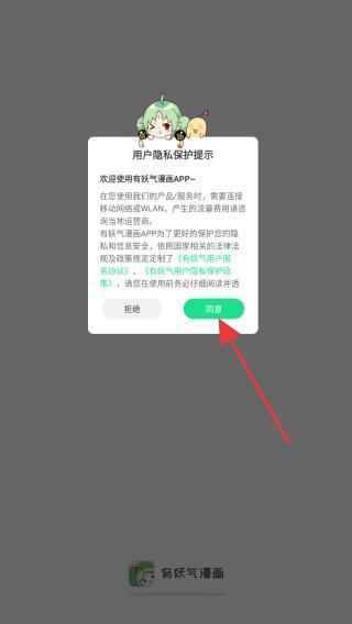 1、打開有妖氣APP,進(jìn)入時(shí)會彈出用戶隱私保護(hù)提示,點(diǎn)擊同意的按鈕即可繼續(xù)。