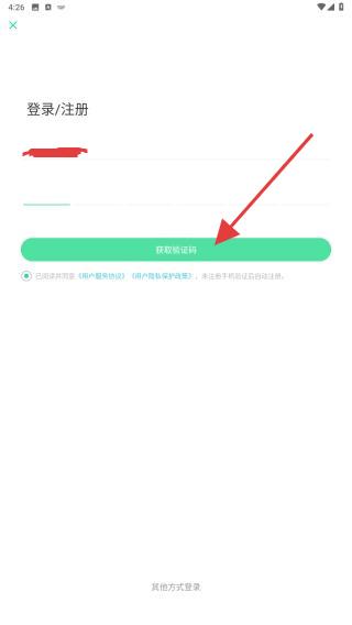 3、在登錄/注冊的頁面內(nèi),輸入登錄的手機(jī)號,再點(diǎn)擊獲取驗(yàn)證碼。