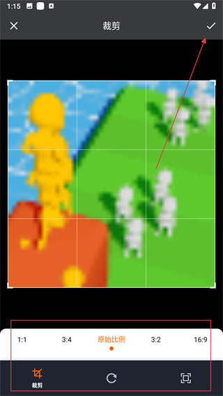 3、進(jìn)入裁剪界面后,可根據(jù)需求選擇比例調(diào)整圖片尺寸,調(diào)整完畢后點(diǎn)擊右上角對勾按鈕,確認(rèn)裁剪設(shè)置。