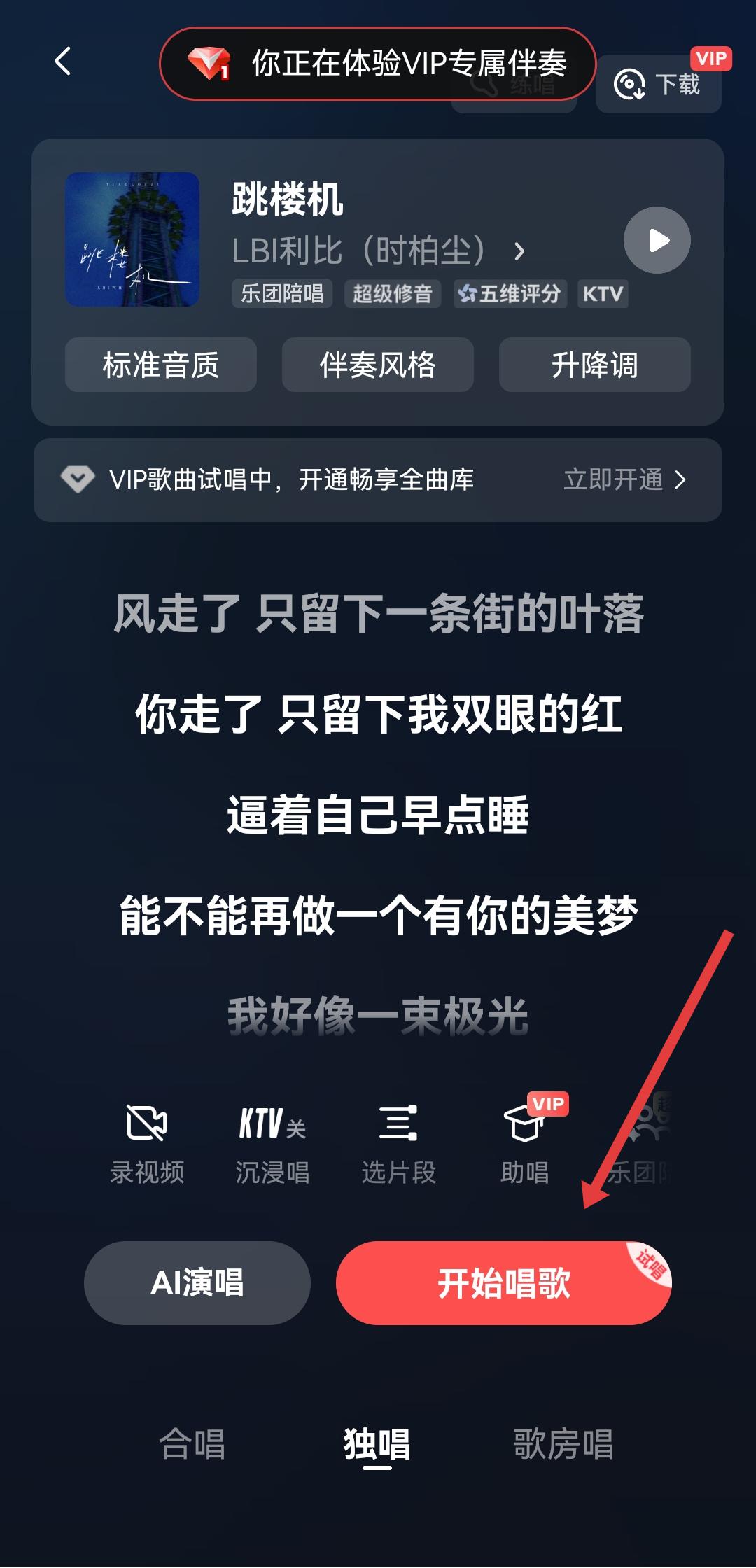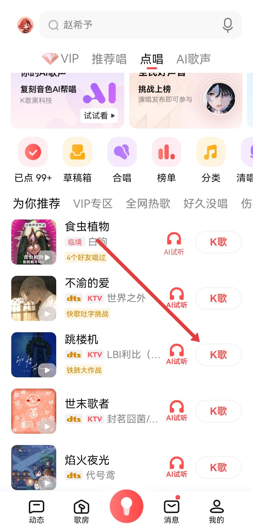 1、進(jìn)入全民K歌點(diǎn)唱頁(yè)面,找到想錄制的歌曲如跳樓機(jī),點(diǎn)擊歌曲右側(cè)的K歌按鈕,進(jìn)入歌曲錄制準(zhǔn)備界面。