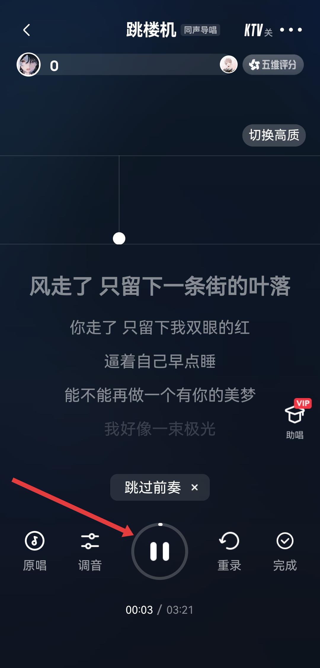 3、在錄制界面中,跟隨歌詞演唱,可以點(diǎn)擊底部暫停/播放按鈕控制錄制進(jìn)程,錄制完成后點(diǎn)擊完成按鈕結(jié)束錄歌。