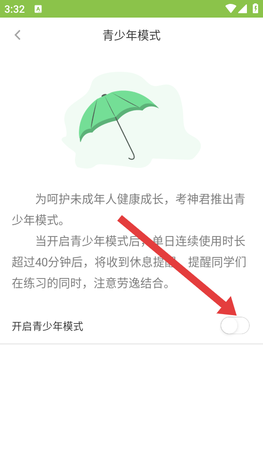 4、在青少年模式頁面開啟開啟青少年模式開關(guān),完成模式設(shè)置。