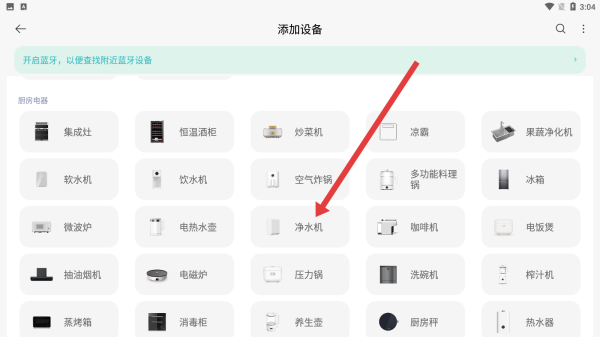 2、跳轉(zhuǎn)到添加設(shè)備頁(yè)面中,點(diǎn)擊廚房電器下的凈水機(jī)設(shè)備進(jìn)行添加。