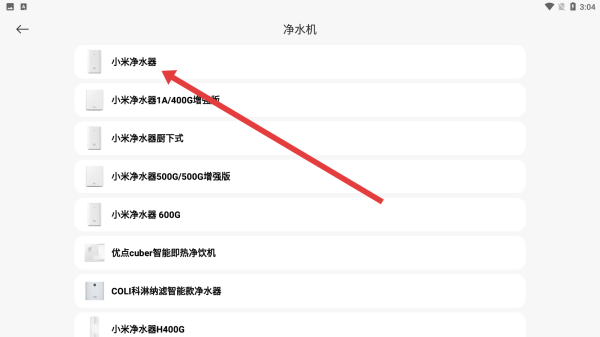 3、在凈水機(jī)多種型號(hào)號(hào)中,點(diǎn)擊選擇小米凈水器進(jìn)行添加。