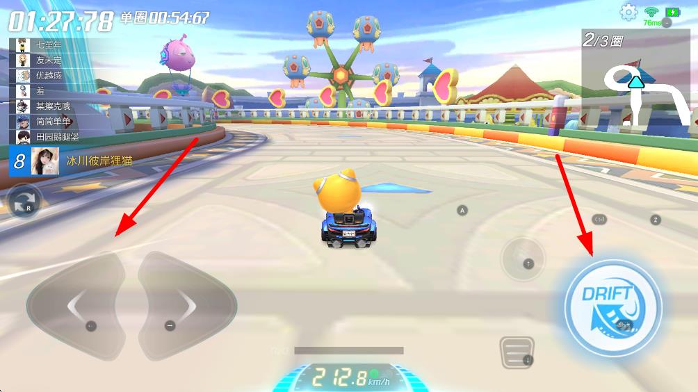 2、當賽車即將進入彎道時,點擊屏幕右側(cè)的DRIFT漂移按鈕,同時配合左側(cè)的方向鍵控制賽車的轉(zhuǎn)向,讓賽車順利進入漂移狀態(tài)。