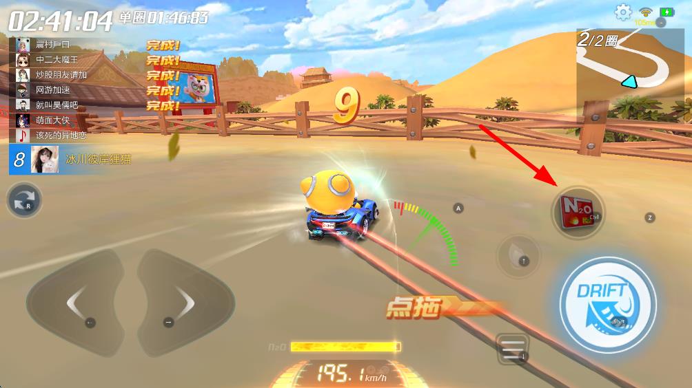 3、在漂移過程中,通過調(diào)整方向鍵來保持賽車的漂移軌跡,當集氣條蓄滿后,會生成氮氣,此時點擊氮氣按鈕釋放氮氣,可獲得加速效果,助力你快速通過彎道并提升比賽成績。