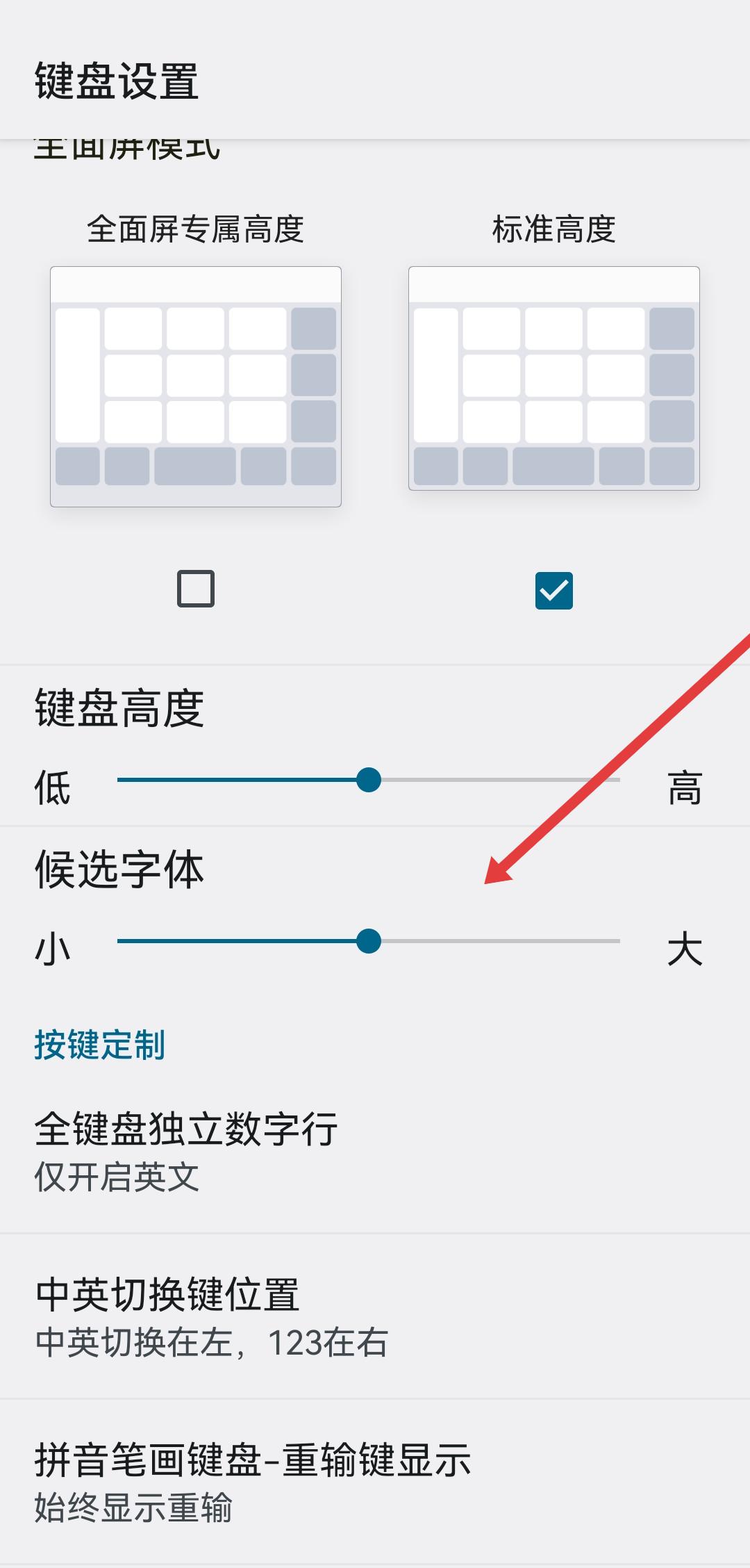 3、在鍵盤(pán)設(shè)置界面里,找到候選字體板塊,通過(guò)拖動(dòng)下方的滑塊來(lái)修改字體的大小,調(diào)整后即時(shí)生效。