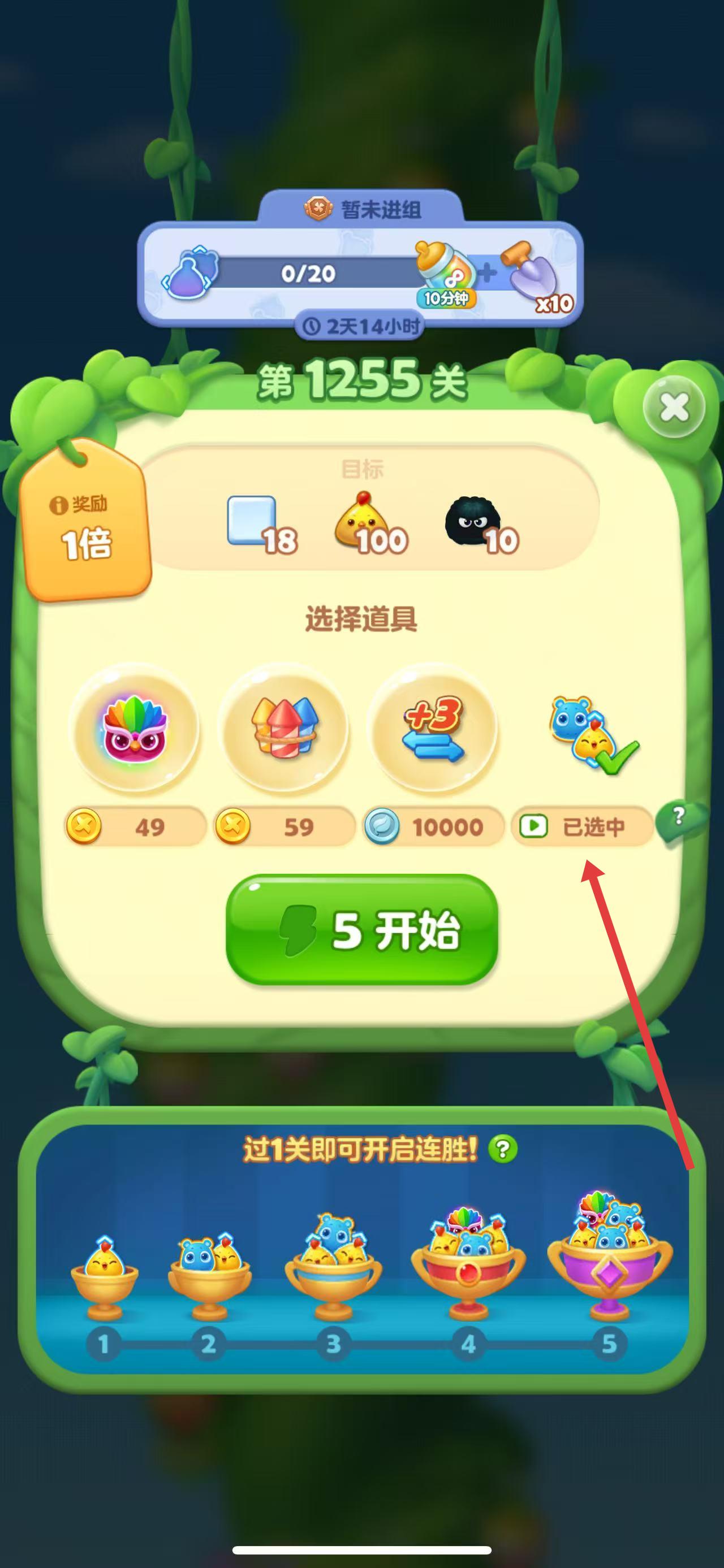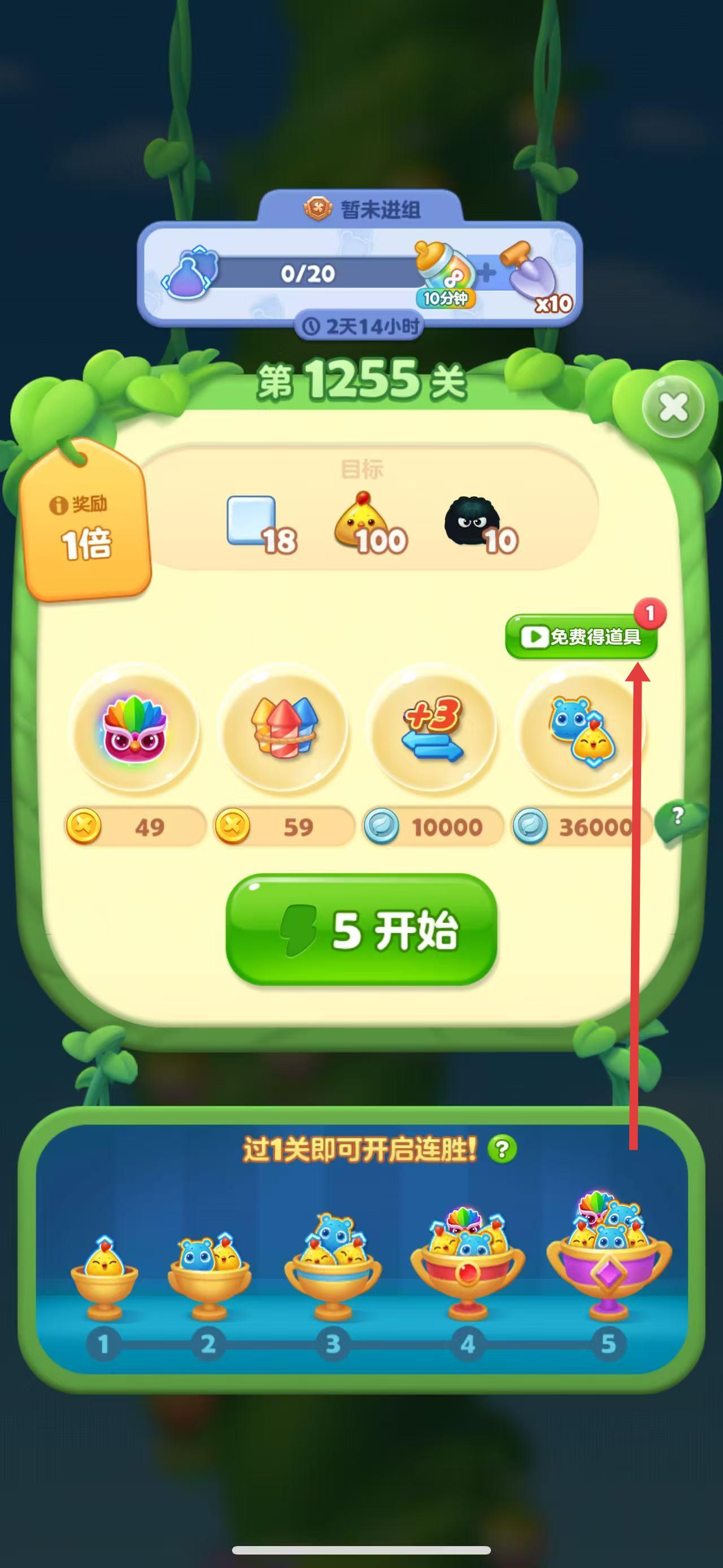 2、在關(guān)卡準(zhǔn)備頁(yè)面中,點(diǎn)擊右上角的免費(fèi)得道具按鈕,查看可獲取免費(fèi)道具的活動(dòng)或任務(wù)。