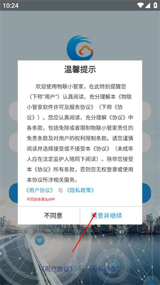 1、在物聯(lián)小管家溫馨提示界面點擊同意并繼續(xù),進入賬號登錄界面。
