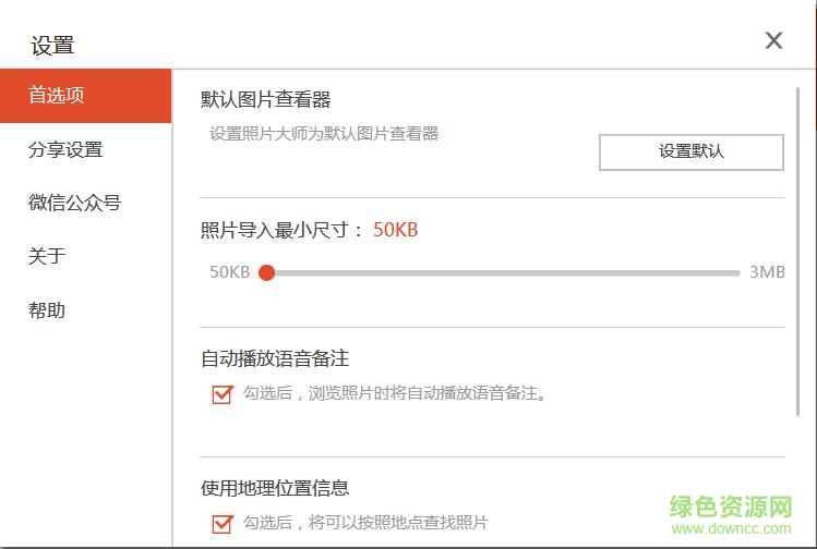在設(shè)置選項(xiàng)中,您可以調(diào)節(jié)導(dǎo)入照片的尺寸,設(shè)置是否將“聯(lián)想照片大師”設(shè)置為默認(rèn)照片查看器,是否自動(dòng)備份照片等.